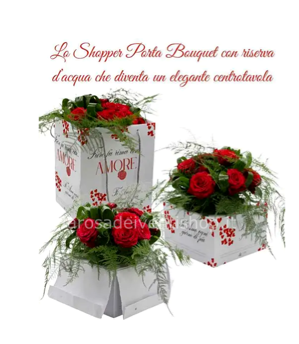 Magic Bring Bouquet cm 24×24 h30 cm è un porta bouquet con riserva d’acqua per bouquet fino a 24-27 cm di diametro. Grazie al manico in cordoncino per il trasporto e un secchiello da 1 litro per la riserva acqua. Il porta bouquet è costituito da 3 componenti: lo Shopper con dedica, il contenitore ermetico per la riserva d’acqua e il supporto per tenere fermo il contenitore durante il trasporto. Misure in cm: 24×24 h30